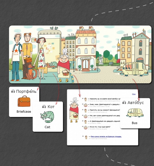 Click characters and objects along your path to hear, repeat, and learn Russian words and sentences. Sequential scenes are thoughtfully designed to help users build on their existing vocabulary, retain knowledge through repetition, and tour the country logically within familiar traveling scenarios. |